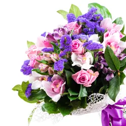 • Стандарт - роза - 3 шт., альстромерия - 5 шт., зелень, упаковка, лента
