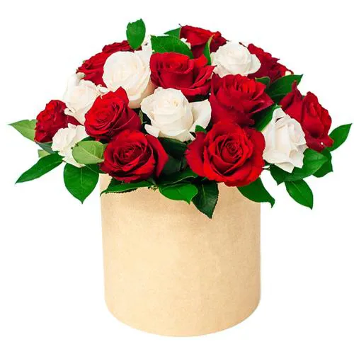 Состав букета: белые и красные розы, зелень, упаковка, лента