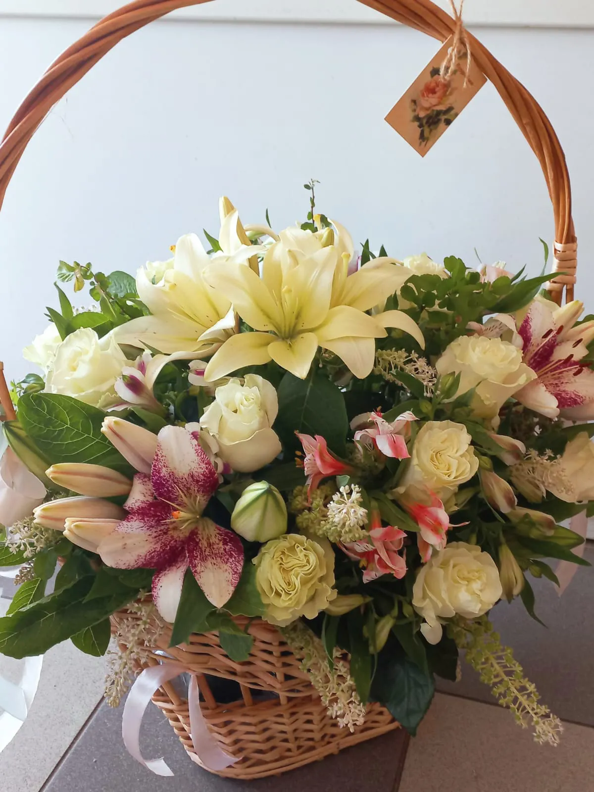 • Стандарт - розы - 5 шт, альстромерия - 6 шт, лилии - 3 шт, кустовая роза - 3 шт, оазис, корзина.