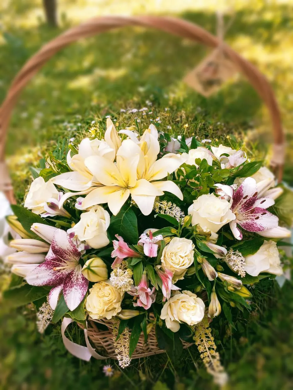 Розы, альстромерии, лилии, кустовые розы, оазис, корзина.
