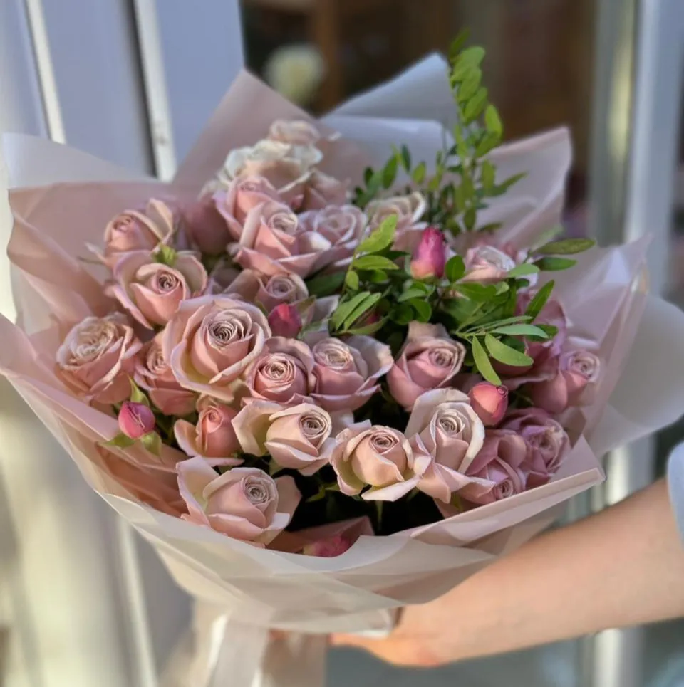 Букет из розовых кустовых роз — это настоящий символ нежности и утонченности. Каждая роза в этом букете словно искусно создана природой: ее многослойные лепестки излучают мягкий блеск, а их оттенок варьируется от светлого пастельно-розового до насыщенно-ягодного. Такие розы обладают выразительной форме и изящным ароматом, который наполняет пространство тонкими нотами весенней свежести.