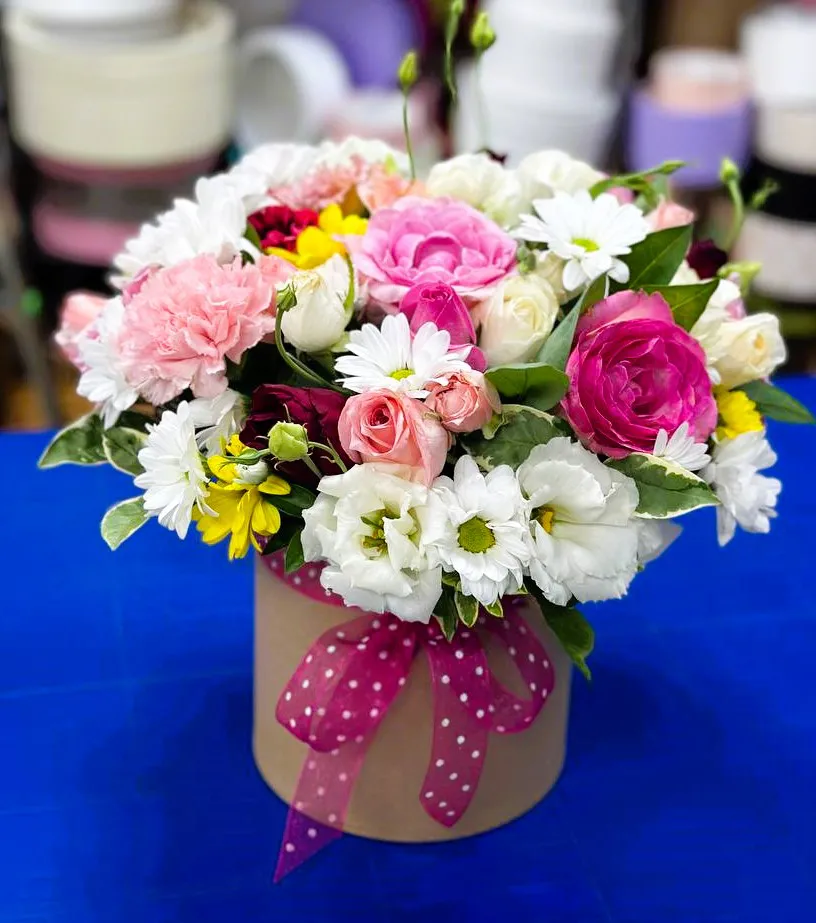 Вдохновляющий букет, располагающийся в стильной шляпной коробке, словно полное чудес волшебство природы. Каждый цветок в этом изысканном ансамбле — это отдельная история, гармонично переплетающаяся с другими. Яркие розы, нежные эустомы, лёгкие гвоздики и утонченные хризантемы создают симфонию форм и оттенков.