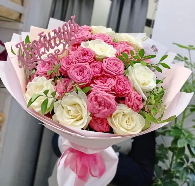 Состав букета: кустовые розы, одноголовые розы ,зелень, упаковка, топпер,лента
