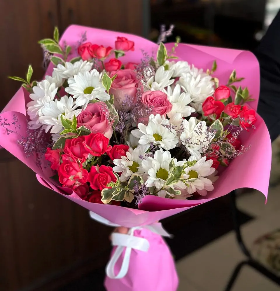 Кустовые хризантемы, с их нежными лепестками и разнообразной цветовой палитрой, придают букету яркость и стиль. В сочетании с классическими розами, которые символизируют любовь и восхищение, такой букет становится настоящим произведением искусства.