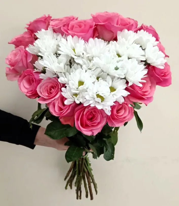 Очаровательный букет, составленный из изысканных розовых роз и нежных ромашковых хризантем, восхищает своим великолепием и очарованием. Каждая роза, словно нежный лепесток любви, утопает в мягком пастельном оттенке, а их бархатистая текстура создает ощущение легкости и романтики. Ромашковые хризантемы, с их яркими белыми лепестками и солнечными желтыми серединками, добавляют живости и игривости в композицию.