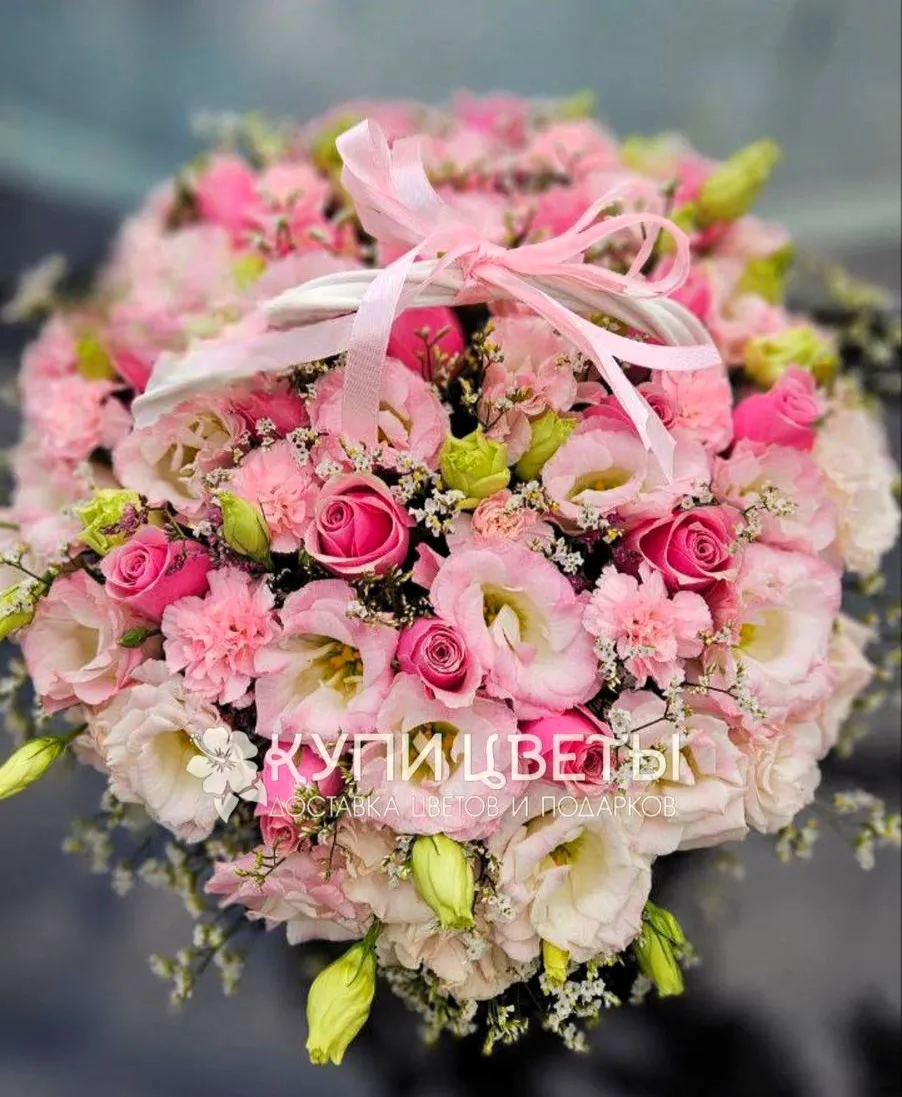 Розы, эустома, гвоздика, зелень, оазис, корзина