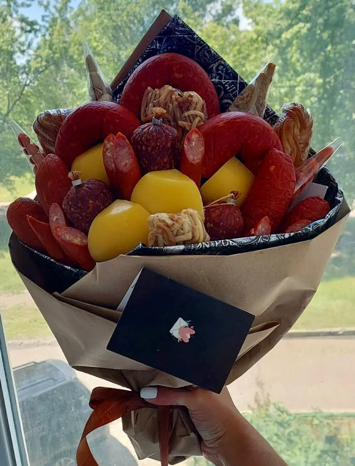 Состав букета: колбаса, хлеб, сыр, колбаски,фисташки.