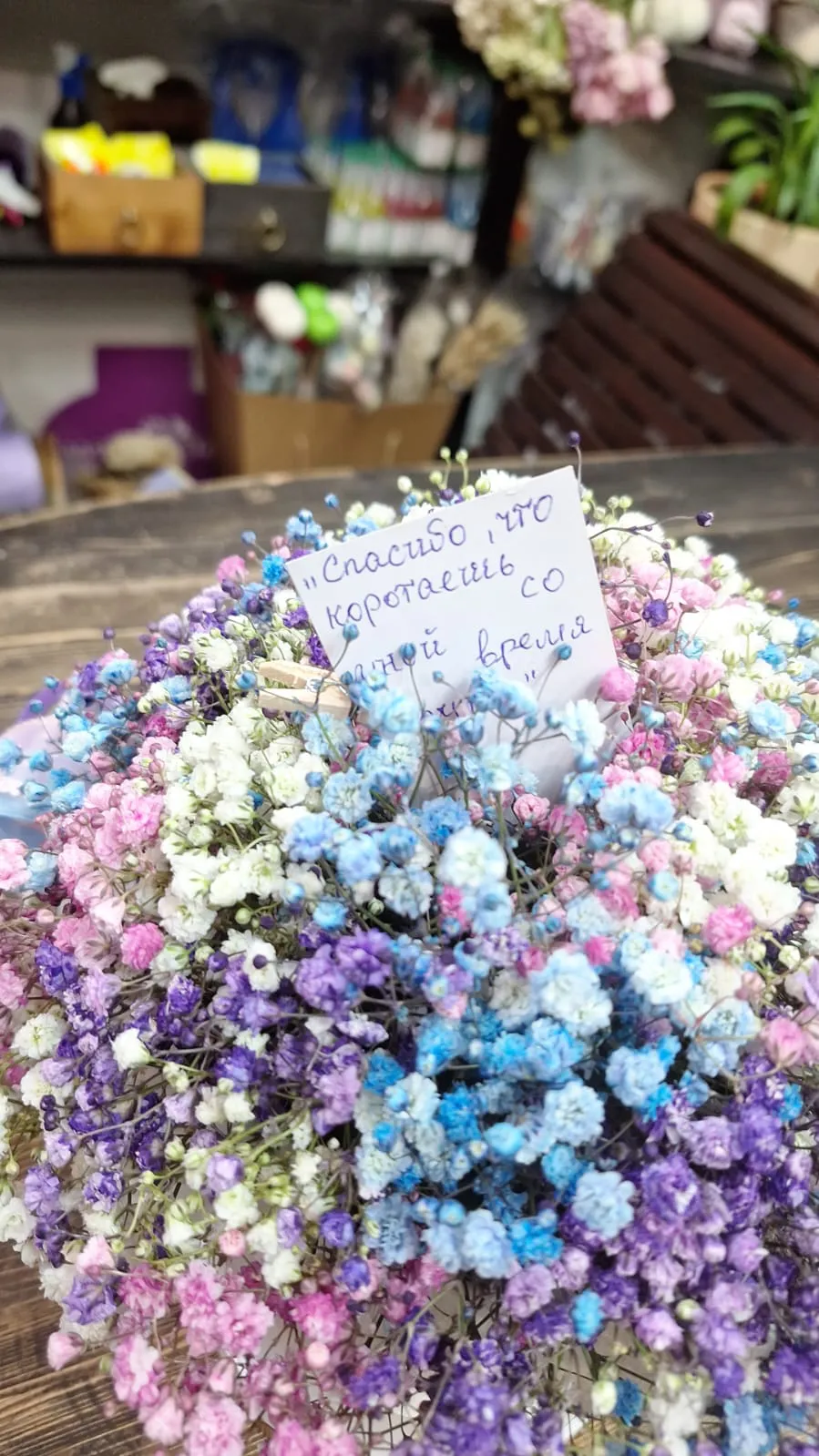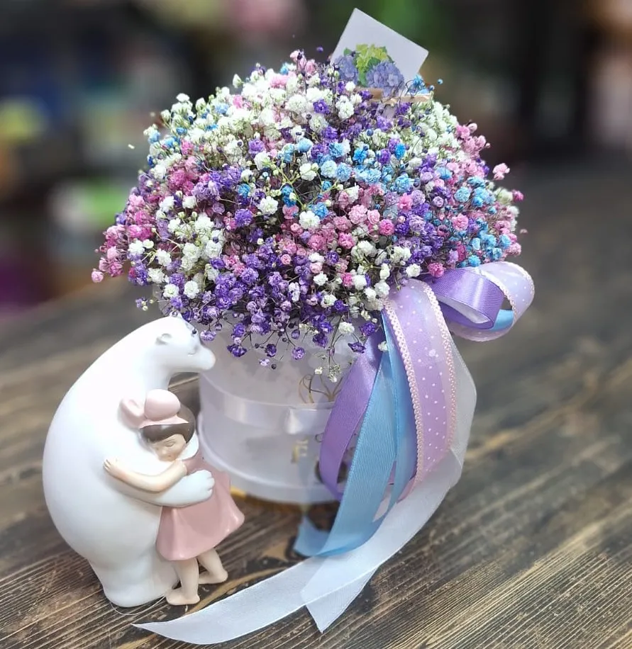 Великолепный букет из разноцветной гипсофилы в стильной шляпной коробке — это настоящее произведение флористического искусства. Легкие и воздушные цветочки гипсофилы, словно облака, нежно смешиваются между собой, создавая игривую палитру оттенков: белого, нежно-розового, голубого и мятного. Каждая веточка добавляет легкость и романтику, наполняя пространство свежестью и атмосферой праздника.