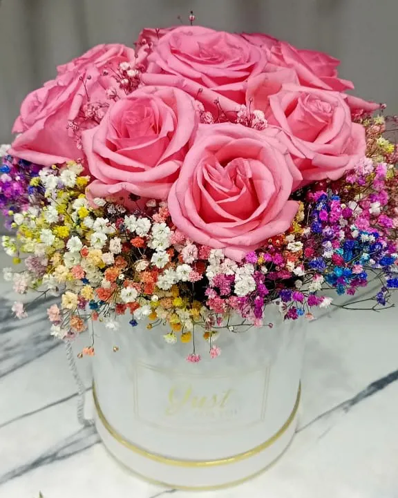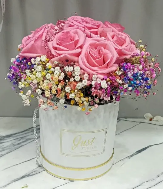 Шляпная коробка, роза, гипсофила