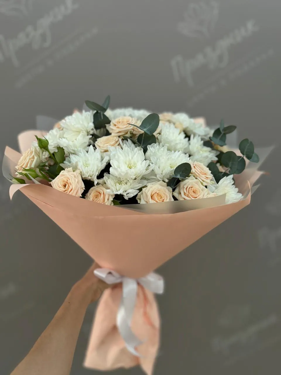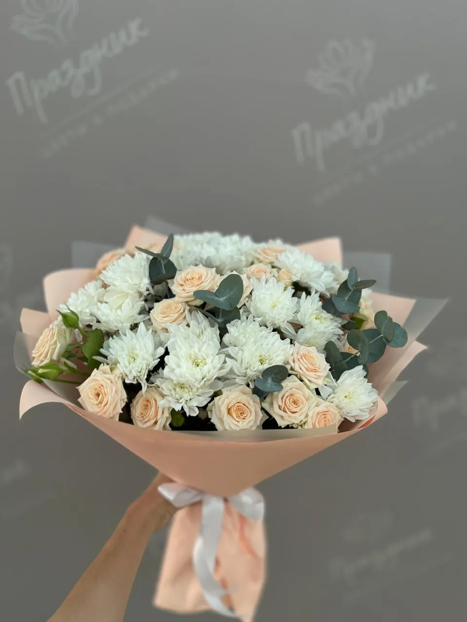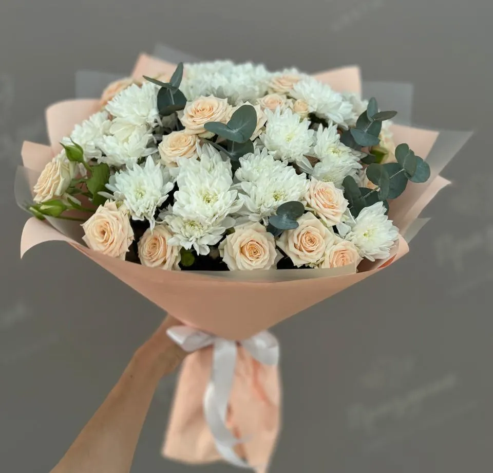 Букет из хризантем и роз Сливочный крем