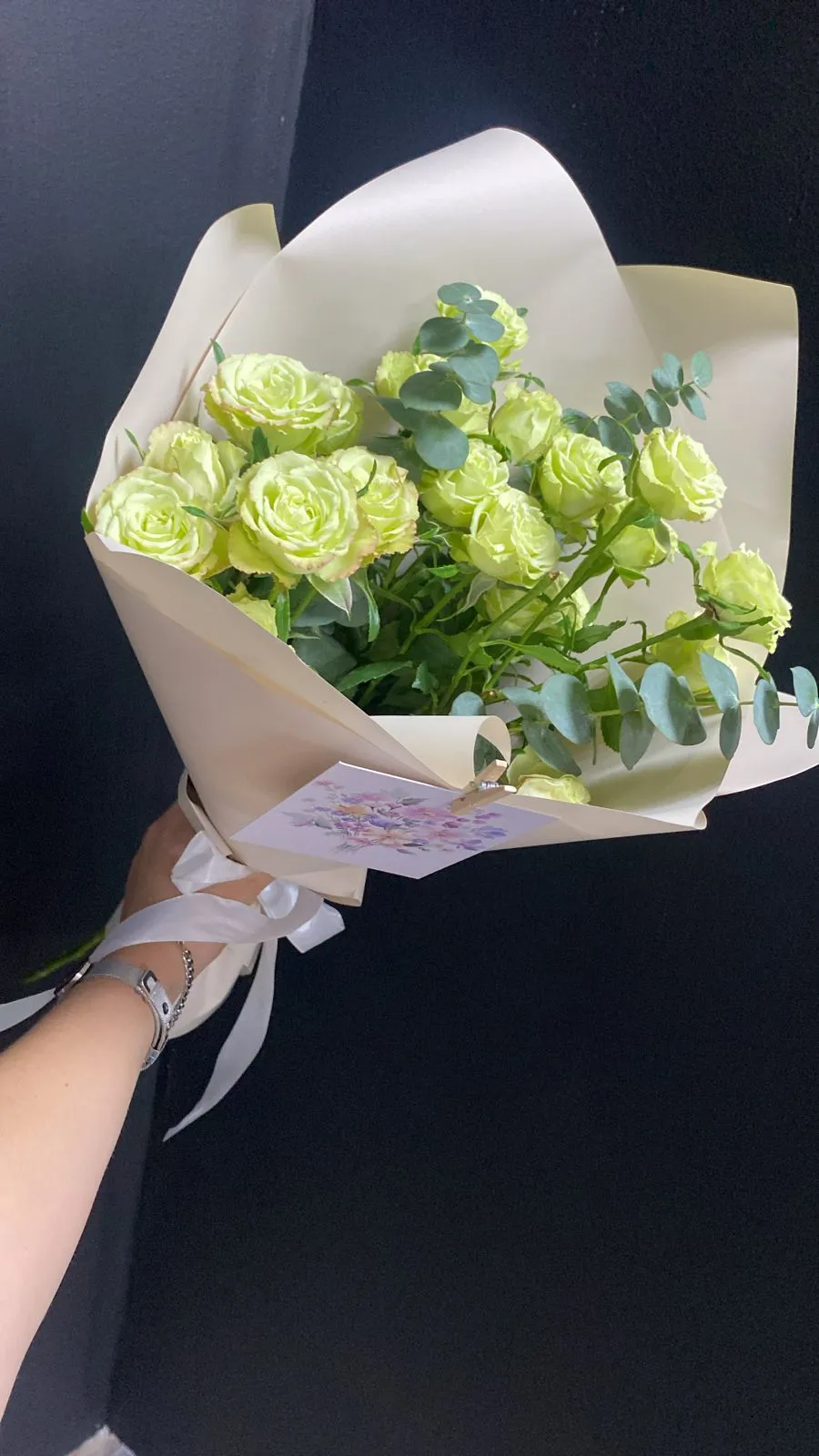 Эвкалипт, с его притягательной текстурой и нежным зелёным оттенком, эффектно дополняет белизну роз. Его листья добавляют легкости и воздушности, создавая изысканный контраст. Аромат эвкалипта проникает в композицию, придавая ей особую атмосферу свежести и уюта.