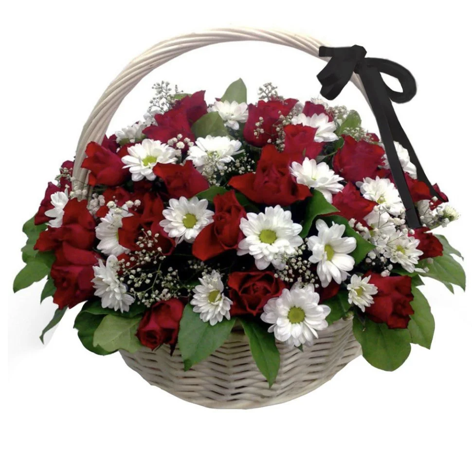 Розы, Ромашковые хризантемы, Гипсофила, Зелень, Корзина, Оазис