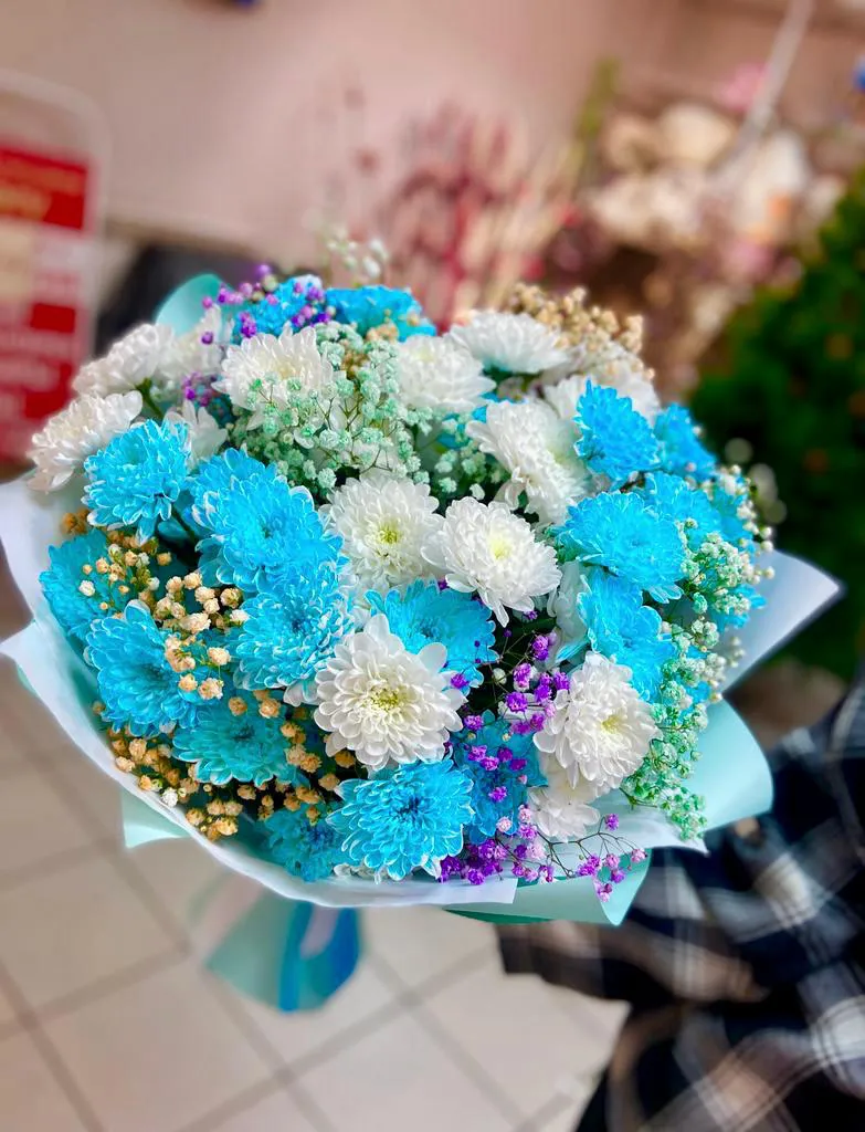 • Премиум - кустовая хризантема - 11 шт., гипсофила, упаковка, лента